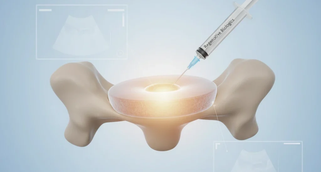 Biologic injection into a degenerated disc to regenerate tissue, restore height, and reduce discogenic pain.