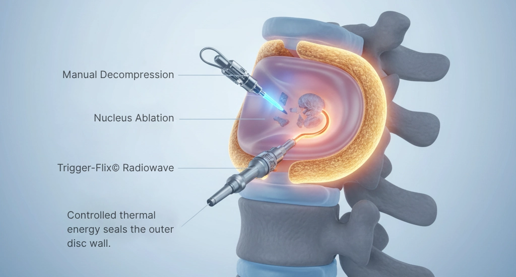 Minimally invasive option for contained herniations combines decompression, radiowave ablation, and annular repair.